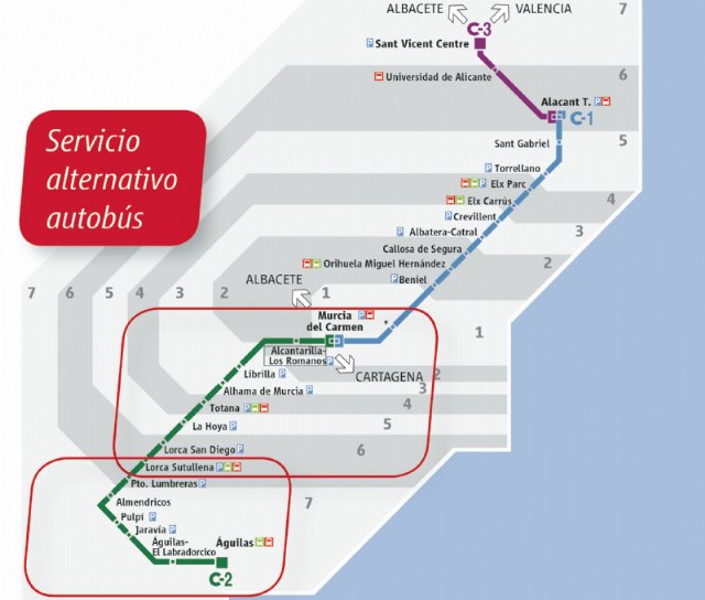 Se establecen, a partir de mañana, horarios alternativos de autobús al cierre de la línea ferroviaria Murcia-Lorca-Águilas por las obras de ADIF