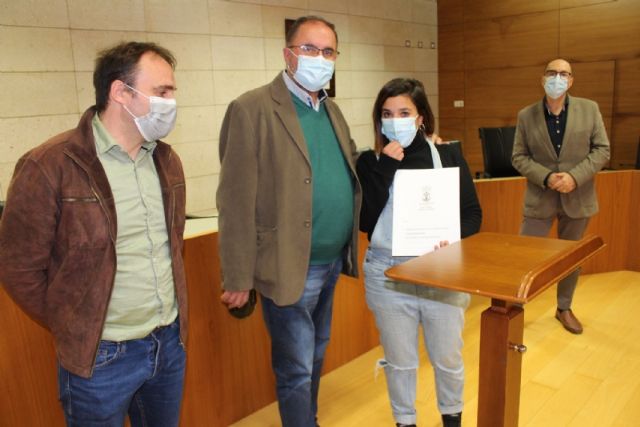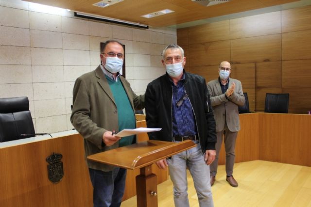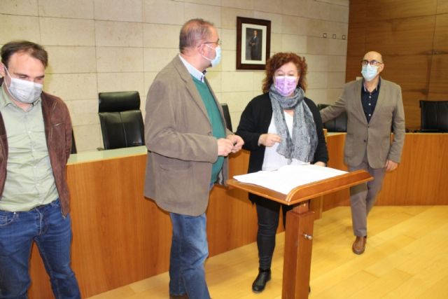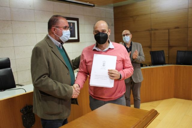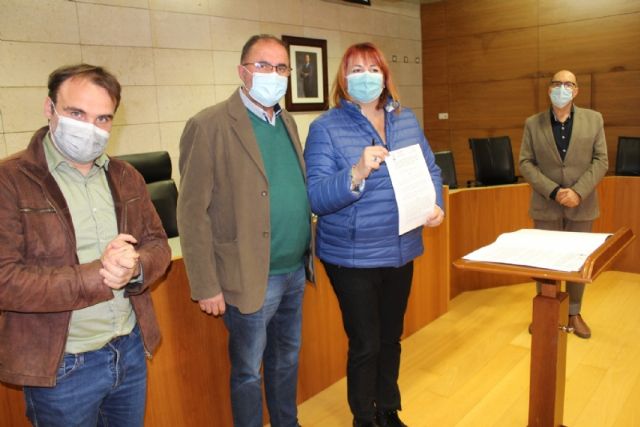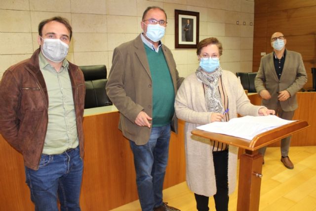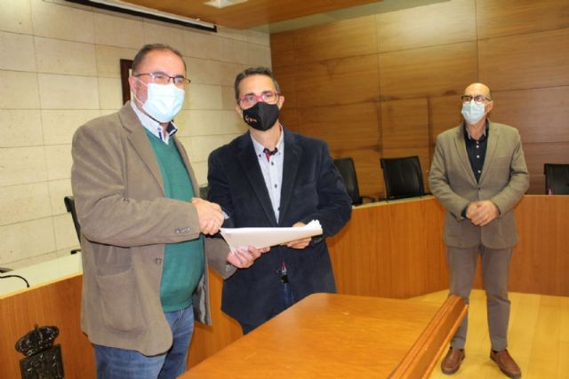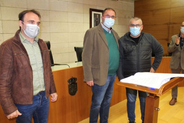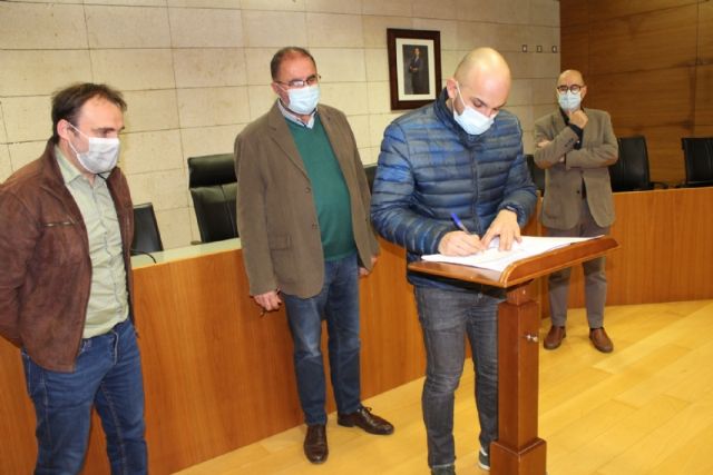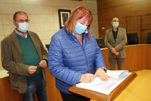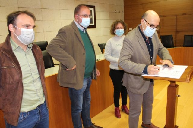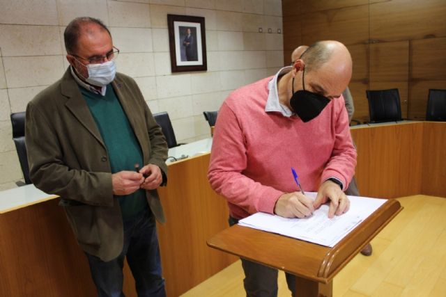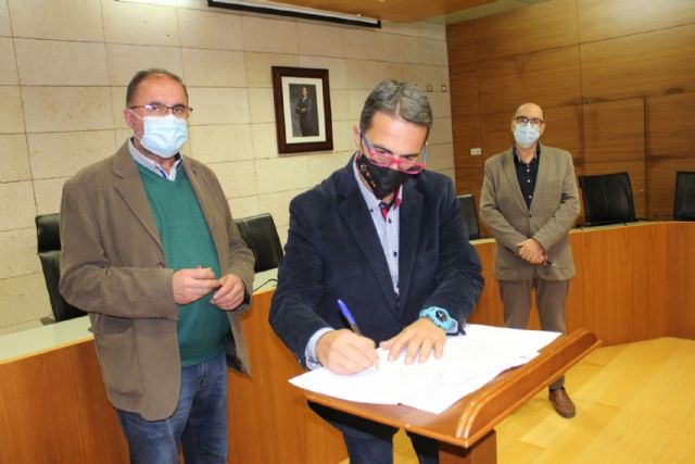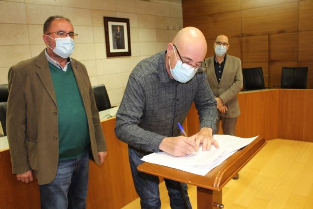 El alcalde, Juan José Cánovas, acompañado por el edil del ramo, procedieron a la firma de los acuerdos en un acto sencillo celebrado en el salón de plenos municipal