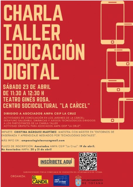 El próximo martes 19 de abril comienza el plazo de inscripción para padres asociados al AMPA del CEIP La Cruz en la charla taller “Educación Digital”, mientras que los no asociados deberán apuntarse durante los días 20 y 21 del mismo mes.