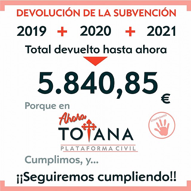 Una subvención que vuelve de nuevo a las arcas del ayuntamiento y que seguiremos devolviendo a lo largo de toda la legislatura, porque no la hemos necesitado para trabajar por Totana.