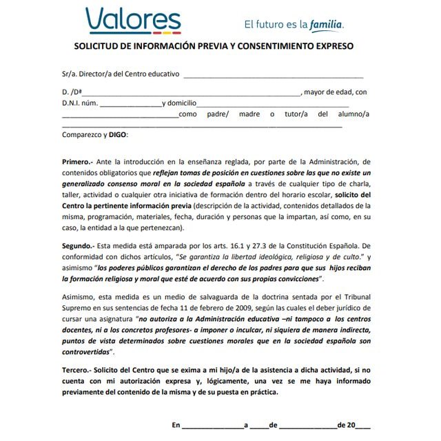 Valores considera muy grave que las actividades se cataloguen como complementarias y no extraescolares para que la asistencia sea obligatoria y posiblemente evaluables, con lo que no hay alternativa posible para decir no a las mismas “Los permisos paternos son esa herramienta que tenemos los padres contra el adoctrinamiento” comenta Miguel Angel.
