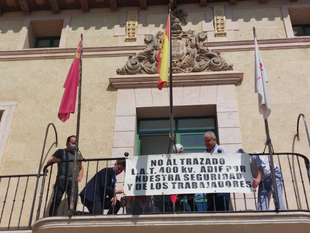 Los representantes de este colectivo ciudadano y de la Corporación municipal colocaron una pancarta reivindicativa en la fachada principal del Consistorio totanero y protagonizaron un acto en el salón de plenos; donde escenificaron el respaldo unánime de todos los grupos municipales al trazado alternativo de Adif y el Corredor Energético en el Valle del Guadalentín.