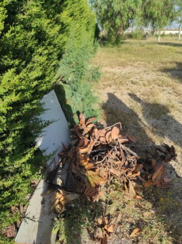 La conservación de los exteriores de la Escuela de Música también está abandonada. Los jardines están plagados de insectos. No se han realizado tratamientos de fumigación por parte del ayuntamiento, como tampoco se han podado sus árboles y arbustos, ni limpiado el perímetro, circunstancia a la que se añade la degradación de materiales, mobiliario y piezas metálicas, como los bordes de los escalones de entrada, que están oxidados y rotos, constituyendo un peligro para el acceso a las aulas.