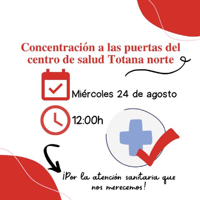 Los vecinos y vecinas de Totana no podemos consentir esta dramática situación, por ello, pedimos a la ciudadanía que mañana miércoles 24 de agosto asista a las 12:00 del mediodía a la concentración a las puertas del Centro de Salud Totana Norte en defensa de un Servicio de Pediatría digno para los más pequeños de nuestro municipio.
