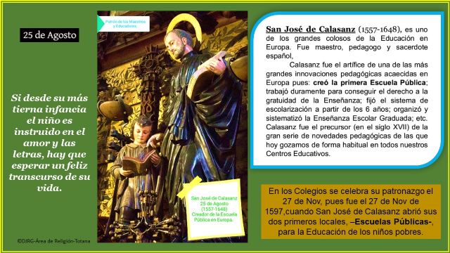 El aragonés José de Calasanz (1557-1648) fue un Maestro, Pedagogo, sacerdote y santo español, cuya festividad litúrgica se celebra cada año, el 25 de agosto. Estudió Filosofía, Derecho y Teología en las universidades de Lérida, Valencia y Alcalá de Henares. Posteriormente de doctoró en Teología.