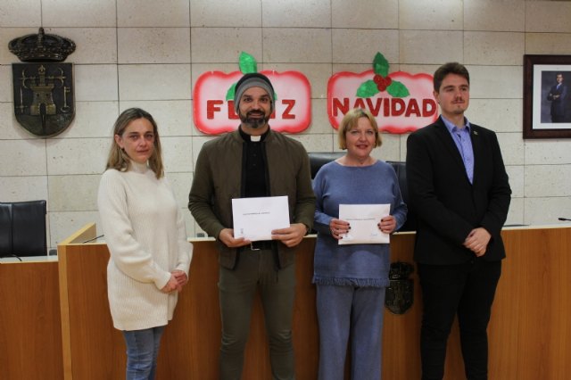 Al acto de entrega han acudido Francisco José Fernández García, presidente de Cáritas Parroquial de Santiago, y Lucía Vivancos Martínez, presidenta de Cáritas Parroquial Tres Avemarías.