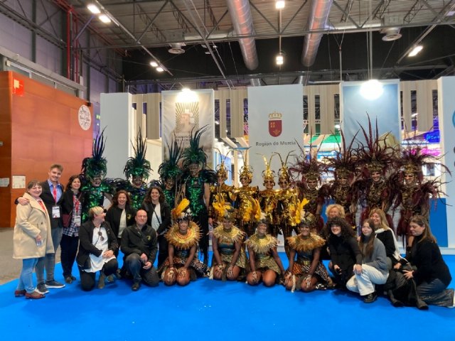 Representantes de la Federación de Peñas de Carnaval de Totana han presentado durante la mañana de hoy el Carnaval totanero en la Feria Internacional de Turismo de Madrid (Fitur), a través de una amplia representación de vestuario, maquillaje y coreografías.