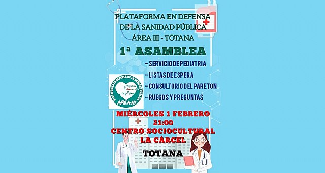 La Plataforma en Defensa de la Sanidad Pública del Área III, que aglutina a más de 80 organizaciones y asociaciones del territorio, va a celebrar una asamblea en el municipio de Totana que tendrá lugar el próximo miércoles, 1 de febrero, en las instalaciones del Centro Sociocultural La Cárcel (21.00 horas), según informan fuentes de la Concejalía de Sanidad.