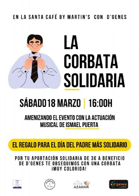 El próximo sábado, 18 de marzo, a partir de las 16:00 horas se celebrará en Totana “La corbata solidaria”, una iniciativa promovida por La Santa Café by Martin´s a beneficio de la Asociación de Enfermedades Raras D´Genes y en el marco de la jornada anterior al Día del Padre.