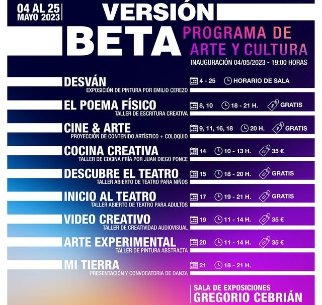 El pasado 4 de mayo se iniciaba, en la Sala de Exposiciones Gregorio Cebrián de Totana, un proyecto cultural envuelto en matices de creatividad, de expectativas, de posibilidades… encuadrado dentro de Versión Beta, programa de arte y cultura. En él la pintura, la poesía, el teatro, la gastronomía, el cine, lo audiovisual, la danza; disciplinas que forman parte de la vida, de las necesidades físicas y espirituales del ser humano, tienen un principal protagonismo. Un aliento que recoge, además, las inquietudes de jóvenes totaneros, habitantes de esta tierra, que nos ofrecen su visión de una realidad fundamentada en el presente y que, a menudo, nos pasa desapercibida.