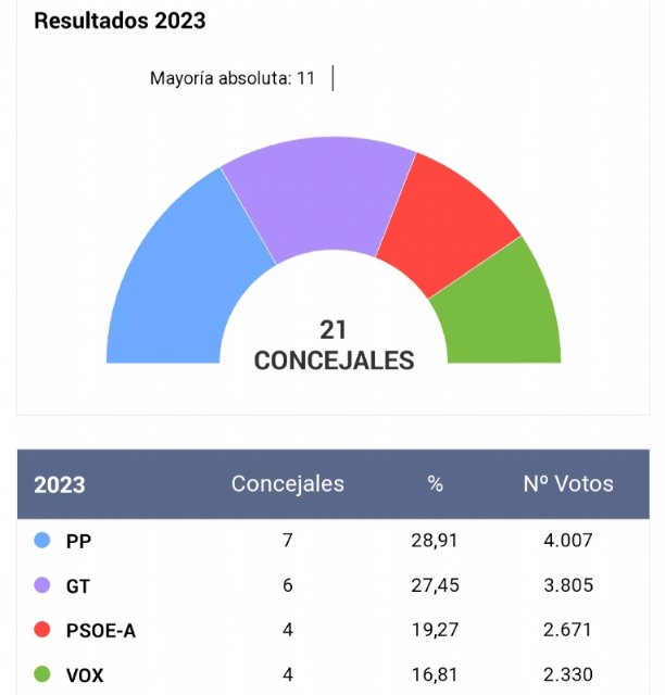 El Partido Popular ganó las elecciones municipales logrando hoy en Totana un total de 4.007 votos (28,91%); Ganar Totana-IU 3.805 (27,45%); el PSOE 2.671 (19,27%), VOX 2.330 (16,81%), La Plataforma Vecinos por Totana 676 (4,87%); Valores 130 (0,93%) y Murcia Libre 123 (0,88%).