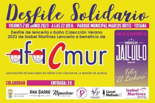 El auditorio del parque municipal "Marcos Ortiz" de Totana acogerá este viernes 2 de junio la séptima edición del Desfile Solidario de Lencería y Baño a beneficio de la Asociación de Familiares de Niños con Cáncer de la Región de Murcia (Afacmur), que cuenta con la colaboración del Ayuntamiento de Totana.