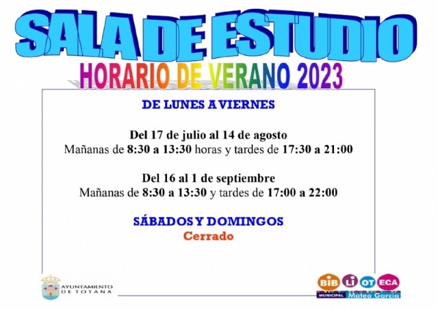 Por su parte, la sala Sala de Estudio tendrá el siguiente horario, del 17 de julio al 14 de agosto (de 8:30 a 13:30 horas y de 17:30 a 21:00 horas); y del 16 al 1 de septiembre (de 8:30 a 13:30 y de 17:00 a 22:00 horas). Los sábados y domingos permanecerá cerrada.