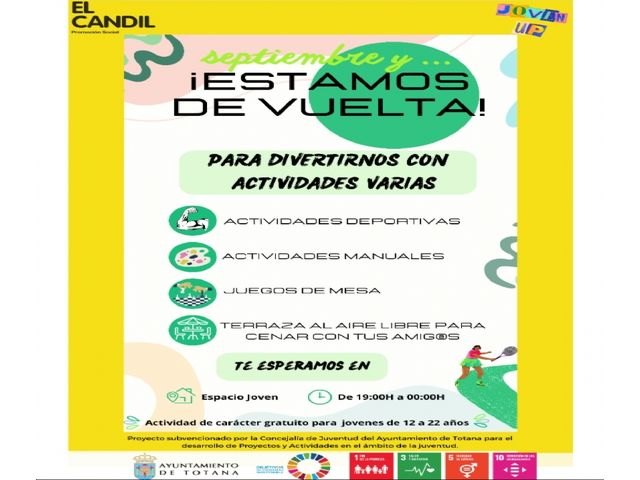 La Concejalía de Juventud informa que este fin de semana se retoma el Proyecto de Dinamización Juvenil “Joven Up” en el Espacio Joven que promueve el Colectivo para la Promoción Social “El Candil”, que dará respuesta socioeducativa y de ocio y tiempo libre, tanto en esta infraestructura de Totana, como en las pedanías de El Paretón, Lébor y Los Cantareros hasta el 28 de octubre.
