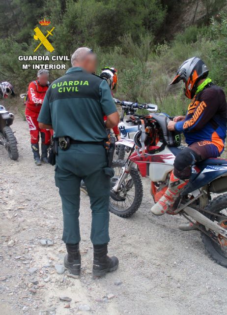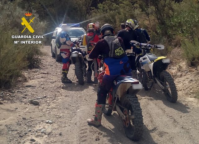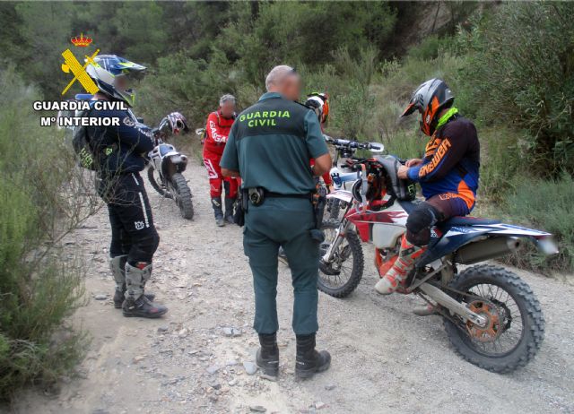 La Guardia Civil de la Región de Murcia ha llevado a cabo un dispositivo para comprobar unas posibles de irregularidades en el término municipal de Totana relacionadas con la posible circulación ilícita de motocicletas por una zona de monte, que se ha saldado con la localización e identificación de un grupo de motoristas que han sido denunciados por infracciones recogidas en la Ley de Aguas y Ley de Montes.