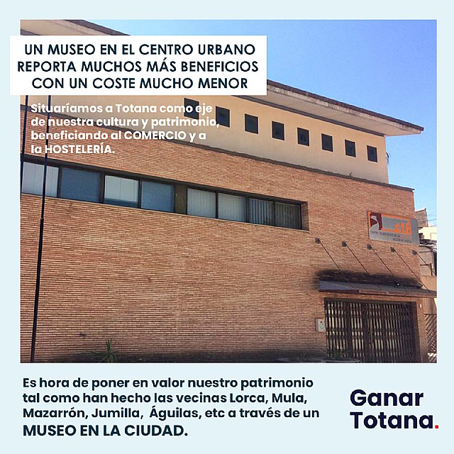 Es hora de hacer una apuesta decidida y reflexionar sobre las oportunidades turísticas que pueden consolidarse en Totana si sabemos invertir ese dinero. Un museo en la ciudad donde se expongan nuestras piezas, nuestra artesanía, nuestra historia y con exposiciones itinerantes, siempre ha estado cerca.