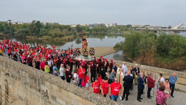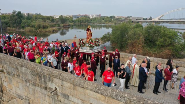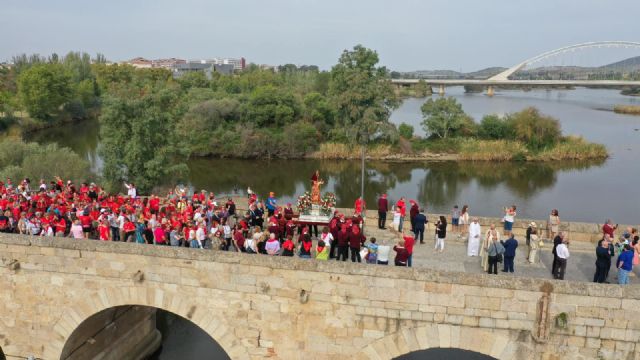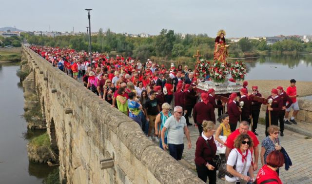 El punto de encuentro entre los peregrinos a pie, los que han realizado el viaje en vehículos particulares y autobuses, las asociaciones de Santa Olalla del Cala y de Almonaster la Real, y la Asociación de Santa Eulalia, con la reliquia de la Mártir bajo el templete de plata, ha sido la cabecera del Puente Romano, junto a la barriada de San Antonio.