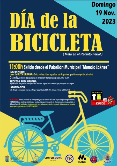 El Día de la Bicicleta se celebra este próximo domingo 19 de noviembre, a partir de las 11:00 horas, con salida desde el Pabellón Municipal de Deportes “Manuel Ibáñez” y meta en el recinto ferial, organizado por la Concejalía de Deportes y el Club Deportivo Terra Sport Cycling