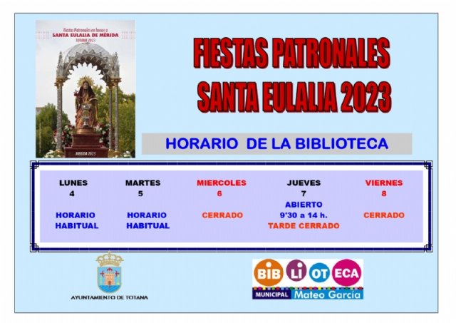 La Concejalía de Cultura comunica que el horario de la Biblioteca Municipal "Mateo García" va a sufrir una serie de modificaciones con motivo de las próximas fiestas patronales de Santa Eulalia 2023.