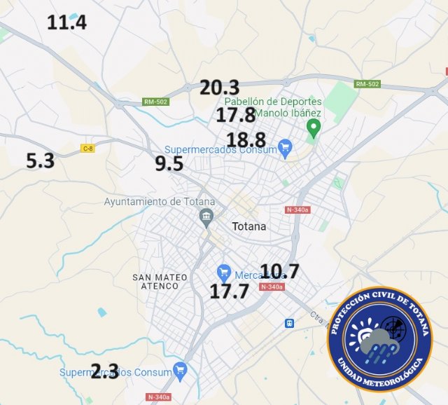 Aunque no se puede dar el episodio por finalizado, pues a esta hora siguen produciéndose chubascos localmente intensos en algunos puntos de la Región de Murcia, podemos ir haciendo balance en el municipio de Totana, donde localmente se han superado los 20 mm. En una imagen adjunta dejamos el listado de las cantidades totales registradas en nuestro municipio hasta ahora.