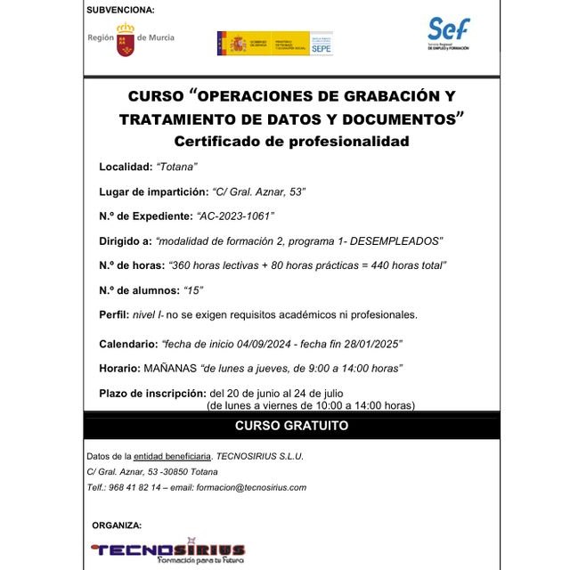 Abierto el plazo de inscripción del curso “operaciones de grabación y tratamiento de datos y documentos”