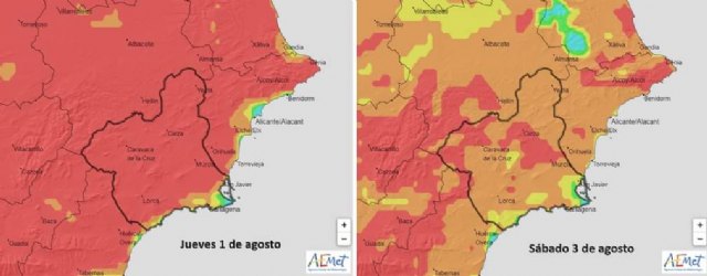 Zonas: Noroeste (43 ºC, localmente 44), Altiplano (43 ºC), y Valle del Guadalentín, Lorca y Águilas y Vega del Segura (42 ºC, localmente 44)
