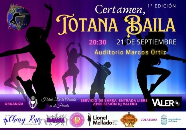 El auditorio “Marcos Ortiz” acoge este sábado 21 de septiembre, a partir de las 20:30 horas, el I Certamen “Totana Baila”, organizado por la Hermandad de la Oración en el Huerto y Nuestra Señora de la Caridad.