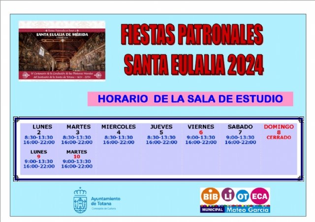 Además, la Biblioteca Municipal de Totana, permanecerá abierta en su horario habitual (de 9.30 a 14.00 y de 17.00 a 20.00 horas), del 2 al 5 de diciembre incluido, cerrando solo los días 6, 9 y 10 de diciembre, que aparecen como festivos dentro del calendario laboral de este año 2024.