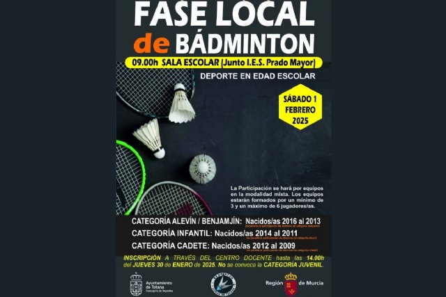 La Concejalía de Deportes informa que mañana sábado 1 de febrero se celebra en la Sala Escolar la Fase Local de Bádminton, organizada por el Club de Bádminton Totana y este propio departamento municipal.