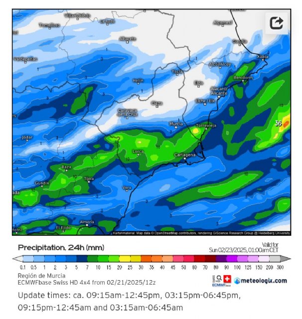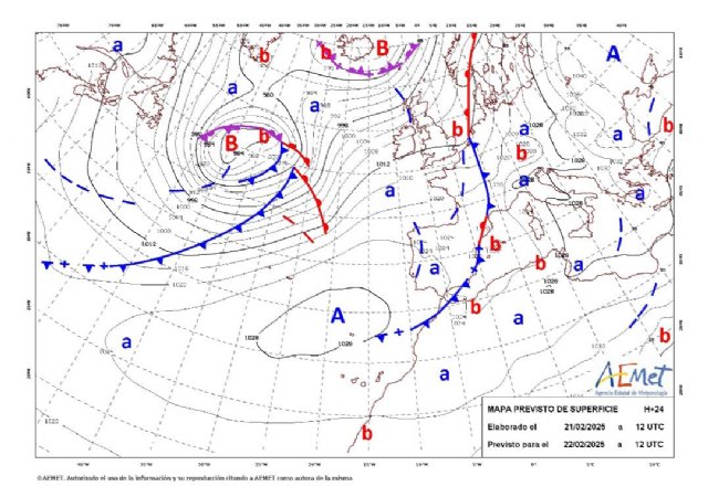 A partir de mediodía, el frente se situará sobre la Región de Murcia y en altura estaremos situados en la parte delantera de una vaguada de aire frío.
