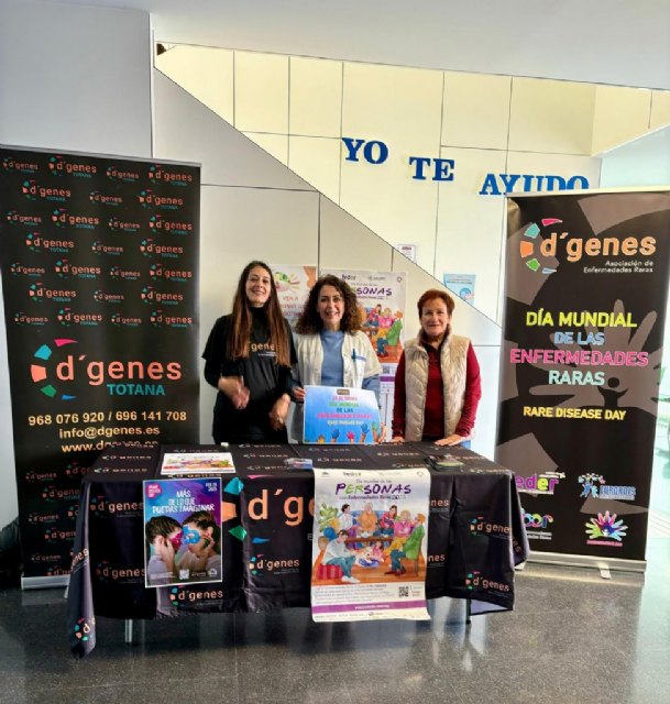 Tanto en el Centro de Salud Totana Norte como en el Centro de Salud Totana Sur se han montado en la mañana del 28 de febrero mesas informativas para dar visibilidad a las enfermedades raras e informar a las personas que se han acercado de qué son las patologías poco frecuentes y de la labor y servicios que presta D´Genes, que en Totana cuenta con el Centro Multidisciplinar «Celia Carrión Pérez de Tudela, para mejorar la calidad de vida de personas que conviven con enfermedades raras y sin diagnóstico y sus familias.