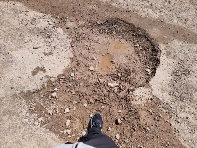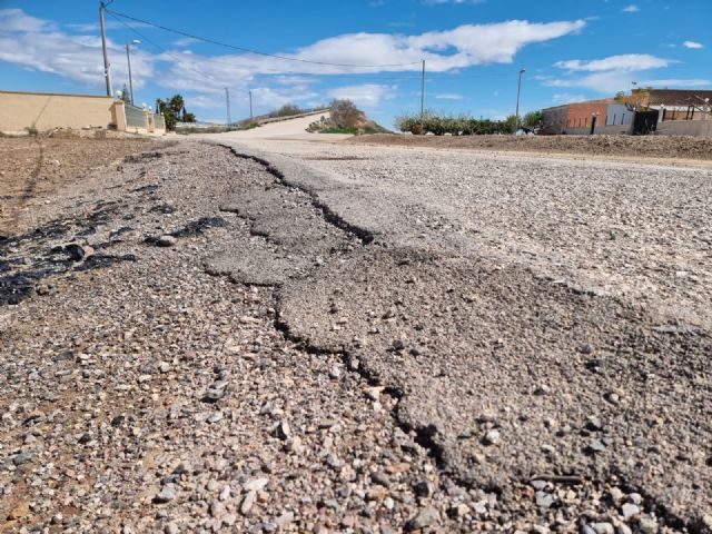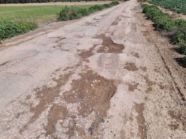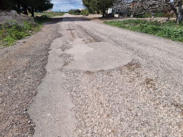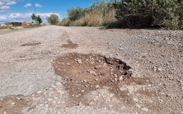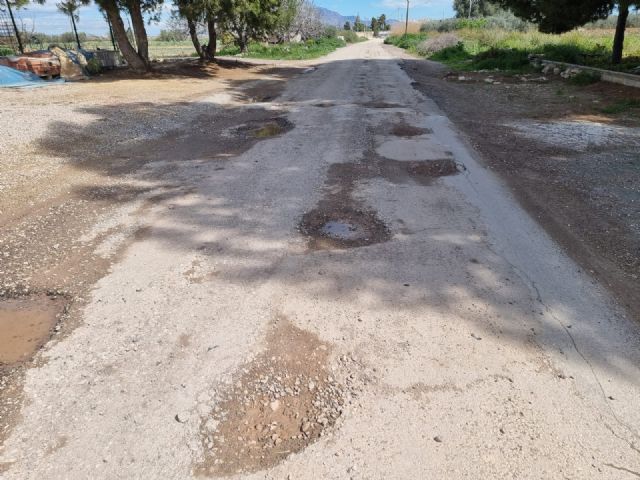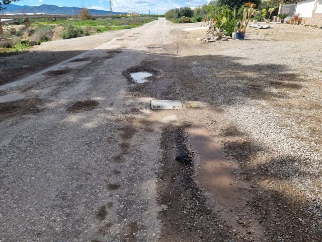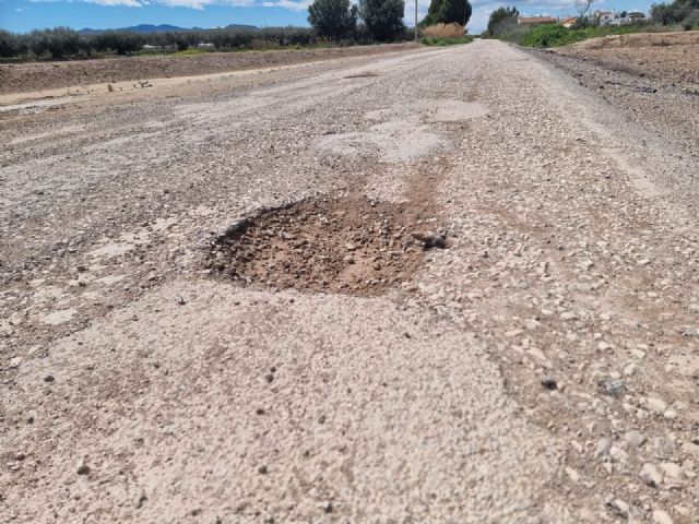 Los vecinos de La Ñorica se enfrentan a un deterioro continuado del camino que conecta la Carretera de Mazarrón (RM 315) a su paso por el Río Guadalentín con la Vía Nueva, marcado por numerosos socavones que obligan a los conductores a abandonar en varios tramos el firme para poder circular.