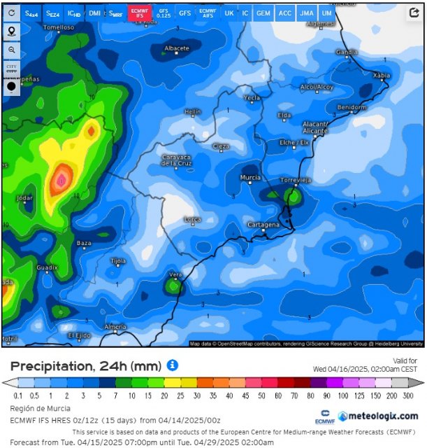 Por la tarde se desarrollarán nubes de evolución que descargarán chubascos dispersos de intensidad débil o localmente moderada, con mayor probabilidad en el centro, este y sureste de la Región de Murcia.