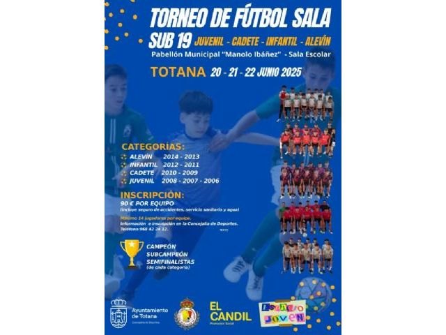 La Concejalía de Deportes, en colaboración con el Colectivo El Candil y la Asociación de Árbitros de Totana, organiza dentro del programa de Ocio Infantil y Juvenil, un torneo de fútbol sala dirigido a las categorías alevín, infantil, cadete y juvenil,  que se celebrará en el Pabellón Municipal “Manolo Ibáñez” y en la Sala Escolar los próximos días 20, 21 y 22 de junio.
