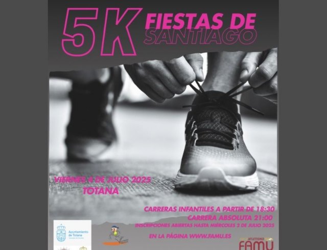 La Concejalía de Deportes organiza, en colaboración con la Federación de Atletismo de la Región de Murcia, la Carrera Popular 5K Fiestas de Santiago 2025, cuya prueba se celebrará el viernes 4 de julio, comenzando las carreras infantiles a las 18:30 horas y terminando con la prueba absoluta a las 21:00 horas.