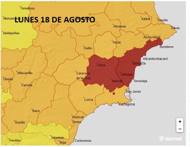 Para el lunes 18 de agosto se ha decretado aviso rojo por riesgo extremo en la Vega del Segura, donde se esperan temperaturas máximas de hasta 44 grados entre las 13:00 y las 21:00 horas.
