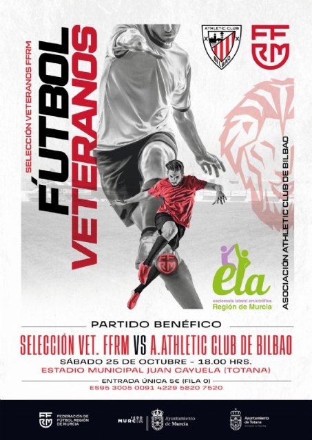 La Selección de Veteranos de la Federación de Fútbol de la Región de Murcia (FFRM) y la Asociación Athletic Club de Bilbao disputará un partido solidario el próximo 25 de octubre, a partir de las 18:00 horas, en el estadio municipal “Juan Cayuela” de Totana, a beneficio de la Asociación ELA Región de Murcia.