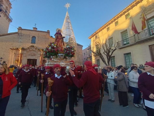 La jornada festiva arranco a las ocho de la mañana, momento en el que se ofició una misa de despedida en la parroquia de Santiago El Mayor, lugar donde llegó el pasado 9 de diciembre para pasar las fiestas patronales y las Navidades.  Tras la misa, a las nueve en punto arrancó el cortejo de los romeros acompañando a La Santa.