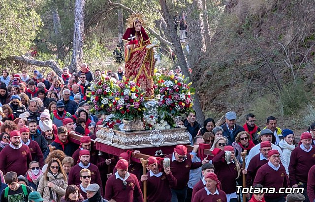 A las nueve en punto, tras la misa, dio comienzo el cortejo romero. El itinerario, de unos siete kilómetros, llevó a la imagen desde el casco urbano hasta el santuario, siendo despedida oficialmente por su pueblo en el paraje del Rulo, antes de adentrarse en un paisaje que combina huertos de cítricos en su primer tramo y bosques de pinos en los aledaños de Sierra Espuña.